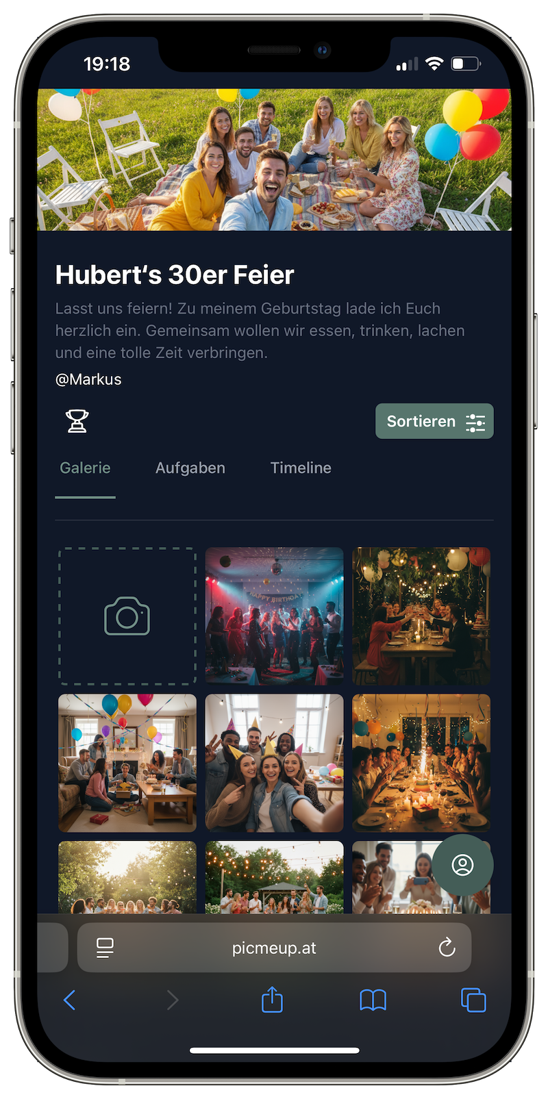 Eure Gäste laden ihre Schnappschüsse direkt hoch – ob Selfies, Gruppenfotos oder witzige Momente. PicMeUp sammelt alles automatisch in eurer Party-Galerie.