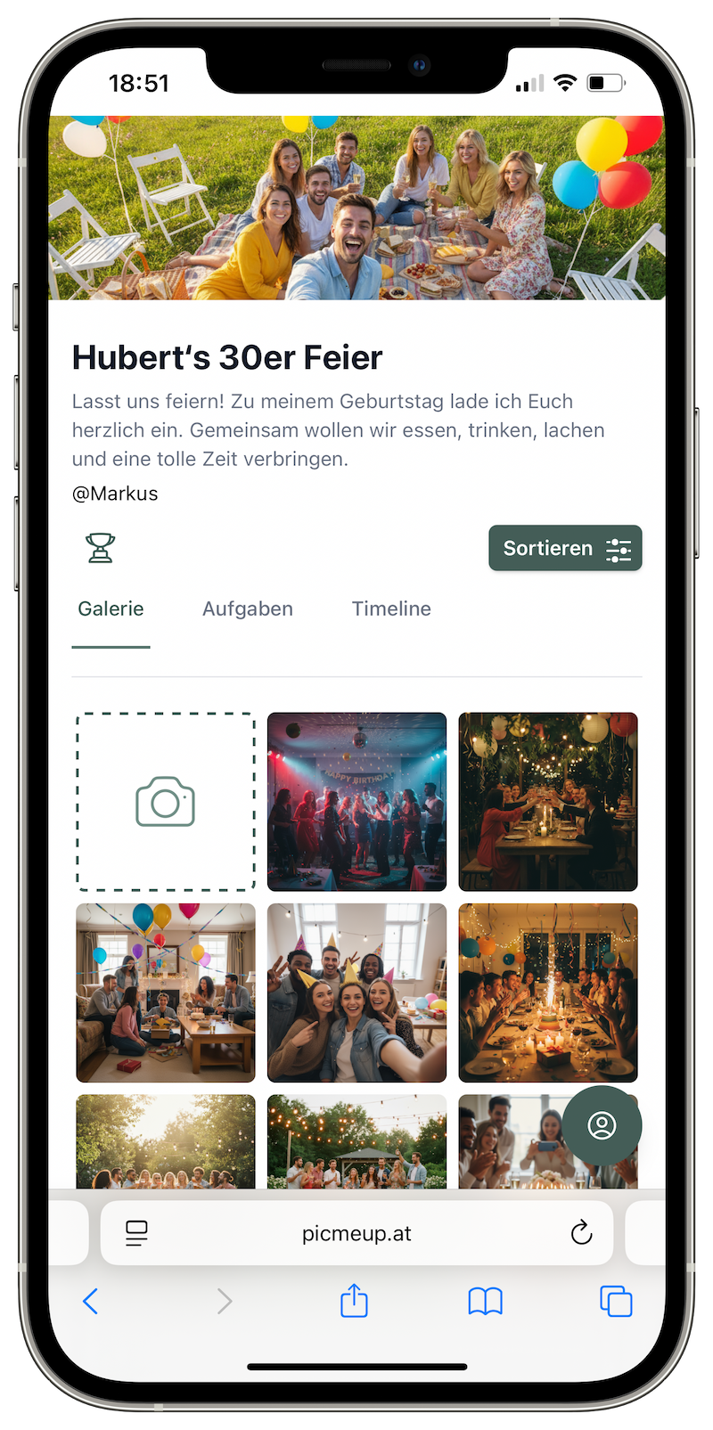 Genieße deine Geburtstagsfeier in vollen Zügen, während PicMeUp alle Fotos und Videos deiner Gäste automatisch an einem Ort sammelt. So kannst du dich entspannen und bekommst am Ende eine Galerie voller Erinnerungen.